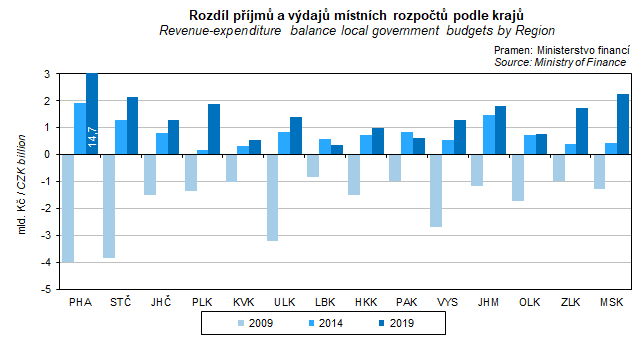 Graf 19. Rozdíl příjmů a výdajů místních rozpočtů podle krajů