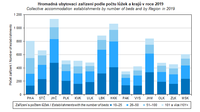 Graf 38. Hromadná ubytovací zařízení podle počtu lůžek a krajů v roce 2019