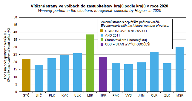 Graf 50. Vítězné strany ve volbách do zastupitelstev krajů podle krajů v roce 2020