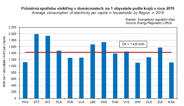 Graf 33. Průměrná spotřeba elektřiny v domácnostech na 1 obyvatele podle krajů v roce 2019