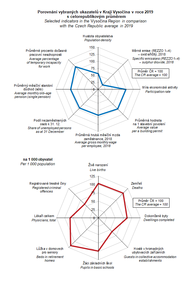 Graf 1. Porovnání vybraných ukazatelů v Kraji Vysočina v roce 2019 s celorepublikovým průměrem