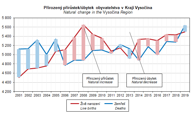 Graf 10. Přirozený přírůstek/úbytek obyvatelstva v Kraji Vysočina