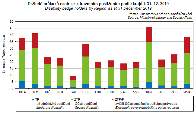 Graf 45. Držitelé průkazů osob se zdravotním postižením podle krajů k 31. 12. 2019