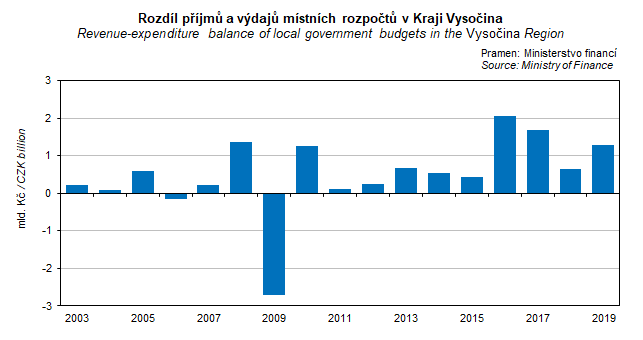 Graf 18. Rozdíl příjmů a výdajů místních rozpočtů v Kraji Vysočina