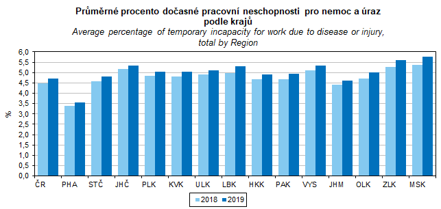 Graf 44. Průměrné procento dočasné pracovní neschopnosti pro nemoc a úraz podle krajů