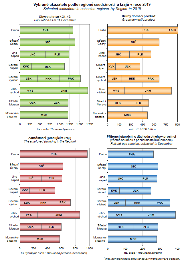 Graf 53. Vybrané ukazatele podle regionů soudržnosti a krajů v roce 2019