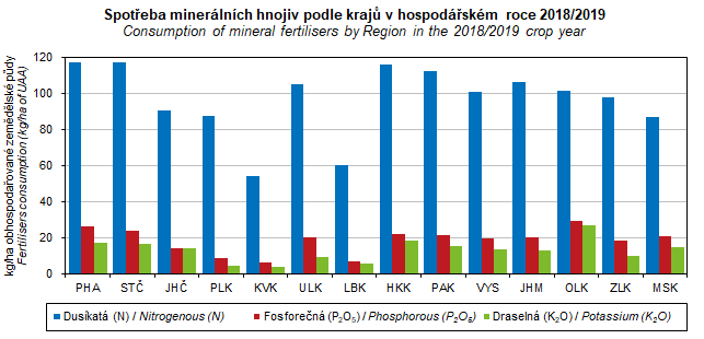 Graf 29. Spotřeba minerálních hnojiv podle krajů v hospodářském roce 2018/2019