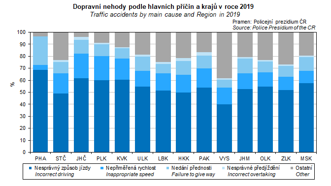 Graf 47. Dopravní nehody podle hlavních příčin a krajů v roce 2019