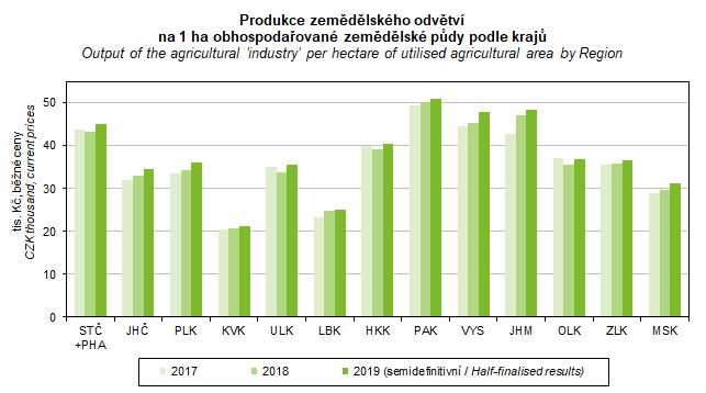Graf 25. Produkce zemědělského odvětví na 1 hektar obhospodařované zemědělské půdy podle krajů