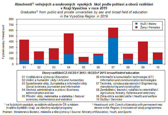 Graf 43. Absolventi veřejných a soukromých vysokých škol podle pohlaví a oborů vzdělání v Kraji Vysočina v roce 2019