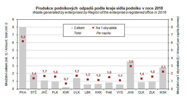 Graf 6. Produkce podnikových odpadů podle kraje sídla podniku v roce 2018