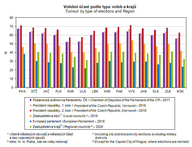 Graf 49. Volební účast podle typu voleb a krajů