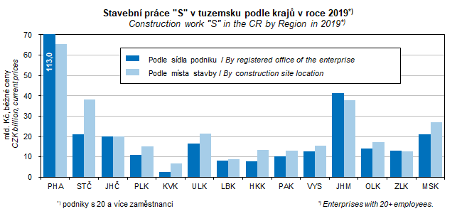 Graf 36. Stavební práce „S“ v tuzemsku podle krajů v roce 2019