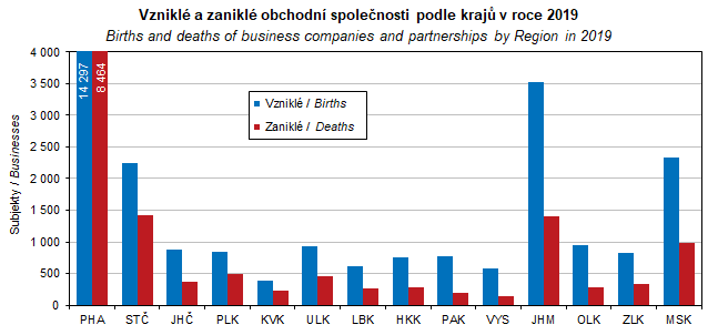 Graf 24. Vzniklé a zaniklé obchodní společnosti podle krajů v roce 2019