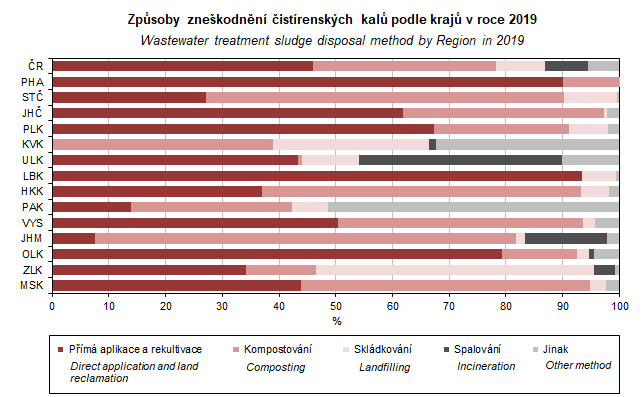 Graf 8. Způsoby zneškodnění čistírenských kalů podle krajů v roce 2019