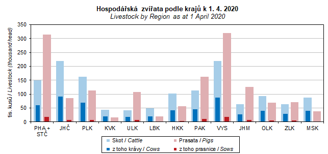 Graf 28. Hospodářská zvířata podle krajů k 1. 4. 2020