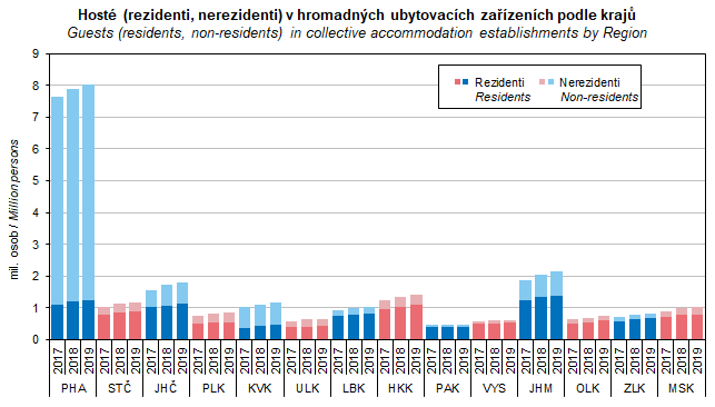 Graf 39. Hosté (rezidenti, nerezidenti) v hromadných ubytovacích zařízeních podle krajů