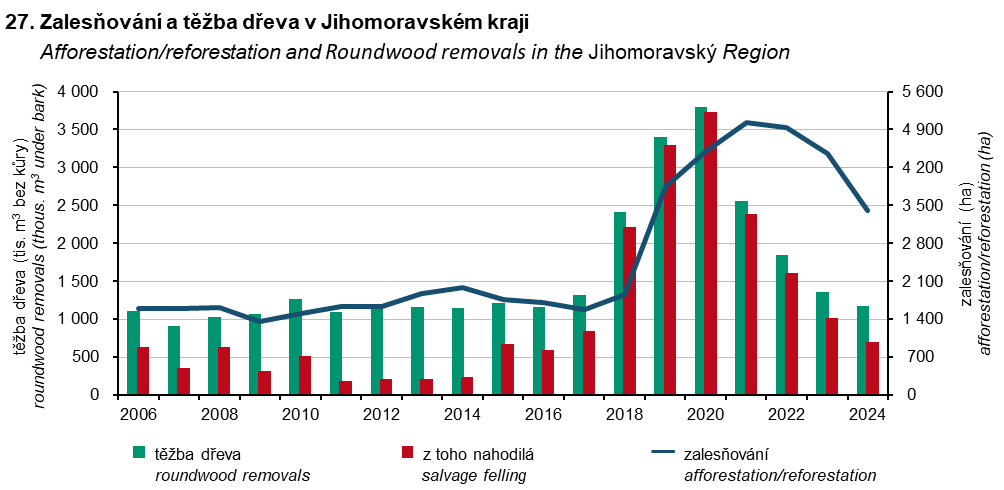 Graf 27 Zalesňování a těžba dřeva v Jihomoravském kraji