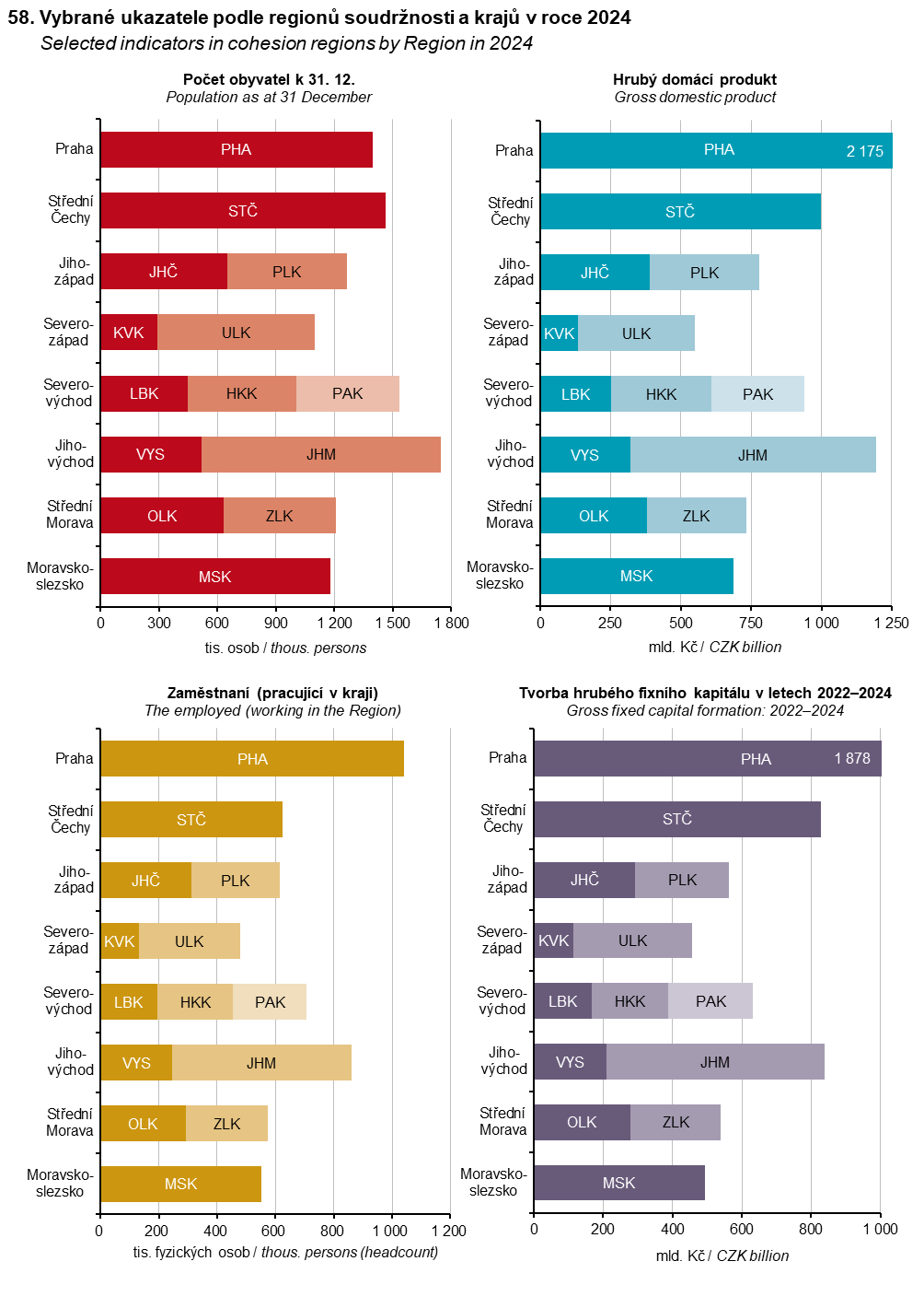 Graf 58 Vybrané ukazatele podle regionů soudržnosti a krajů