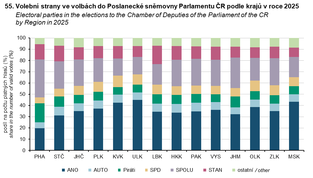 Graf 55 Volební strany ve volbách do Poslanecké sněmovny Parlamentu ČR podle krajů v roce 2025