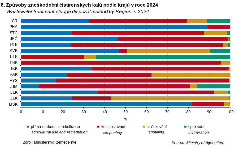 Graf 8 Způsoby zneškodnění čistírenských kalů podle krajů v roce 2024
