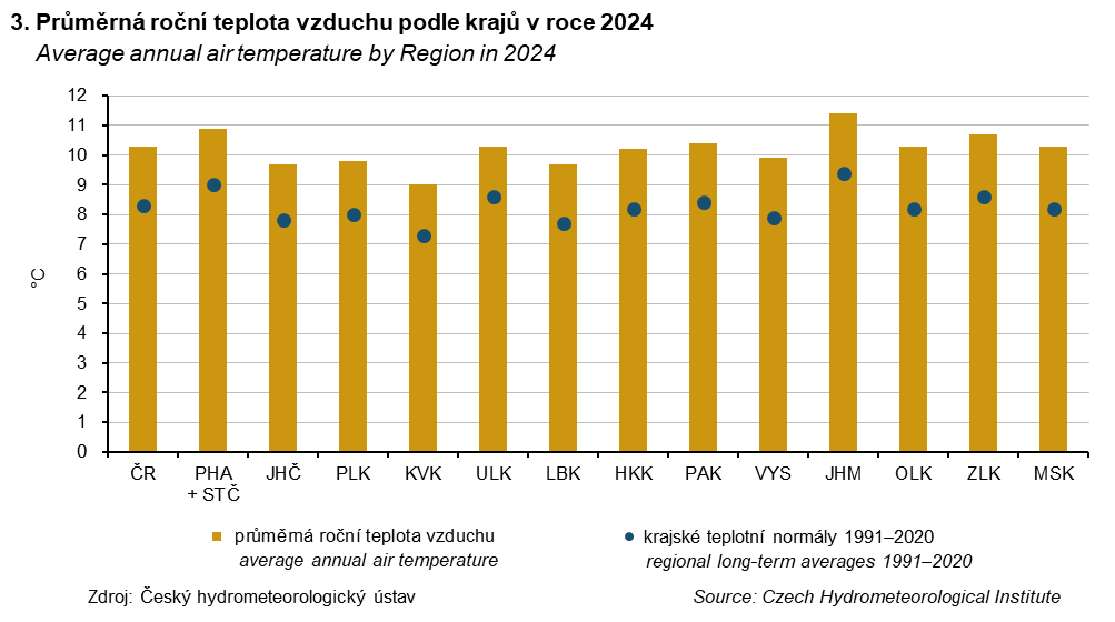 Graf 3 Průměrná roční teplota vzduchu podle krajů v roce 2024