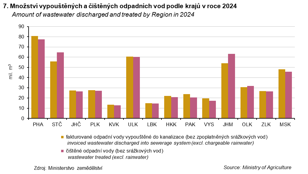 Graf 7 Množství vypouštěných a čištěných odpadních vod podle krajů v roce 2024