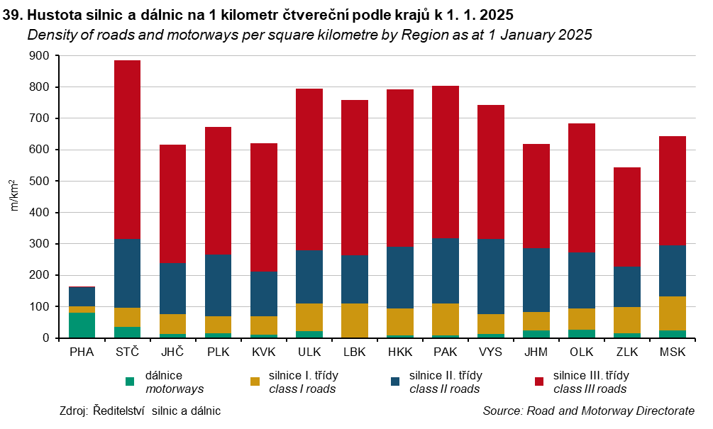 Graf 39 Hustota silnic a dálnic na 1 kilometr čtvereční podle krajů k 1. 1. 2025