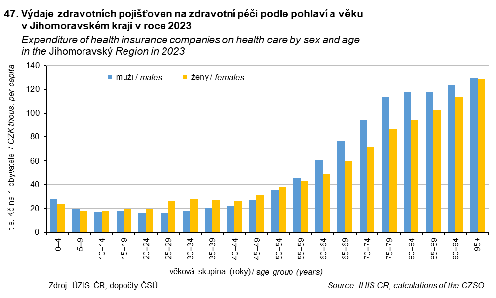 Graf 47 Výdaje zdravotních pojišťoven na zdravotní péči podle pohlaví a věku v Jihomoravském kraji v roce 2023