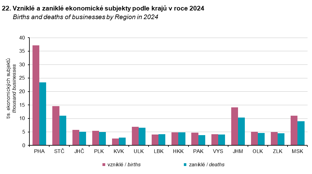 Graf 22 Vzniklé a zaniklé ekonomické subjekty podle krajů v roce 2024