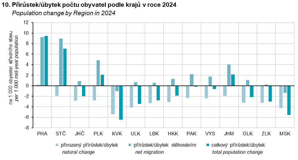 Graf 10 Přírůstek/úbytek počtu obyvatel podle krajů v roce 2024
