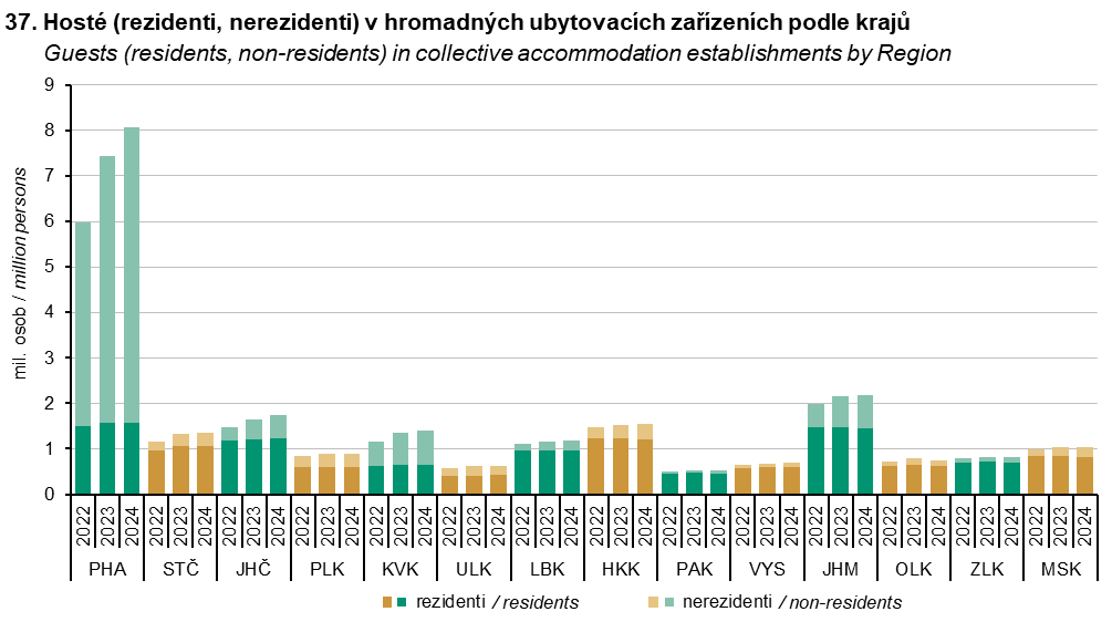 Graf 37 Hosté (rezidenti, nerezidenti) v hromadných ubytovacích zařízeních podle krajů
