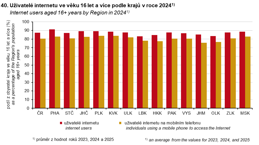 Graf 40 Uživatelé internetu ve věku 16 let a více podle krajů v roce 2024