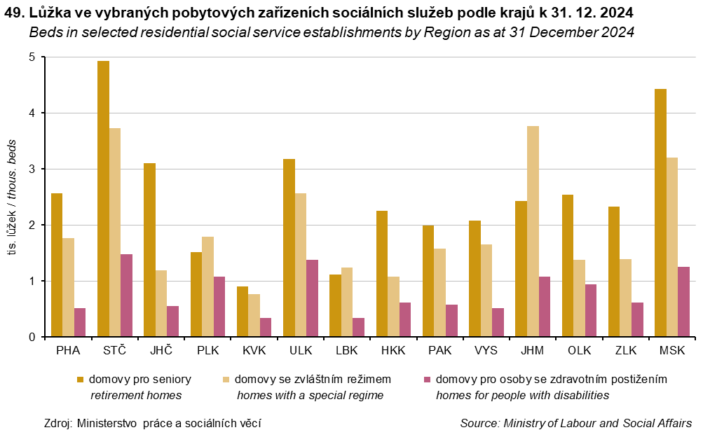 Graf 49 Lůžka ve vybraných pobytových zařízeních sociálních služeb podle krajů k 31. 12. 2024