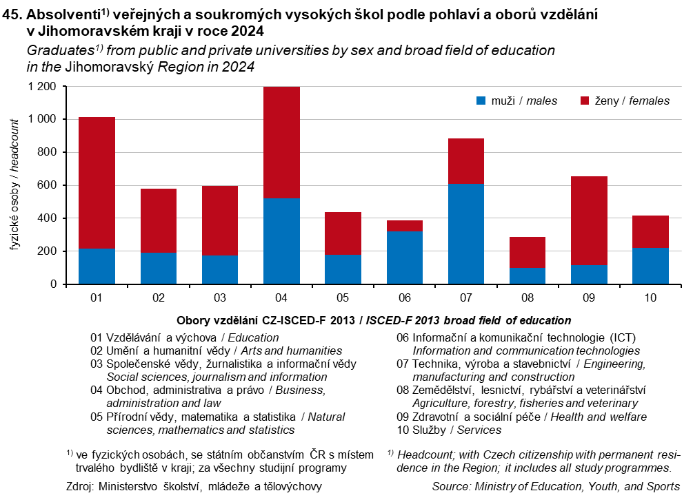 Graf 45 Absolventi veřejných a soukromých vysokých škol podle pohlaví a oborů vzdělání v Jihomoravském kraji v roce 2024