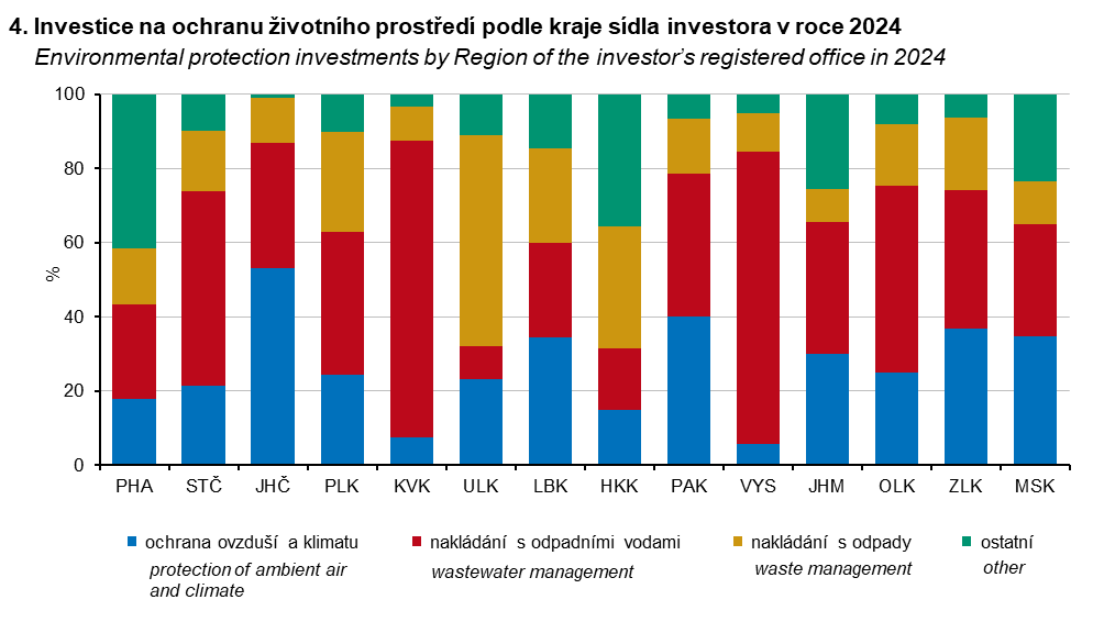 Graf 4 Investice na ochranu životního prostředí podle kraje sídla investora v roce 2024