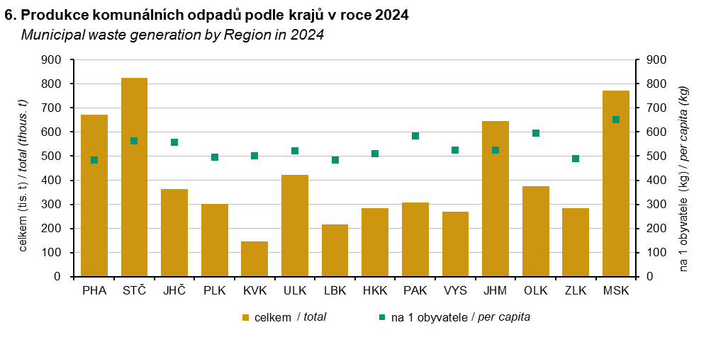 Graf 6 Produkce komunálních odpadů podle krajů v roce 2024