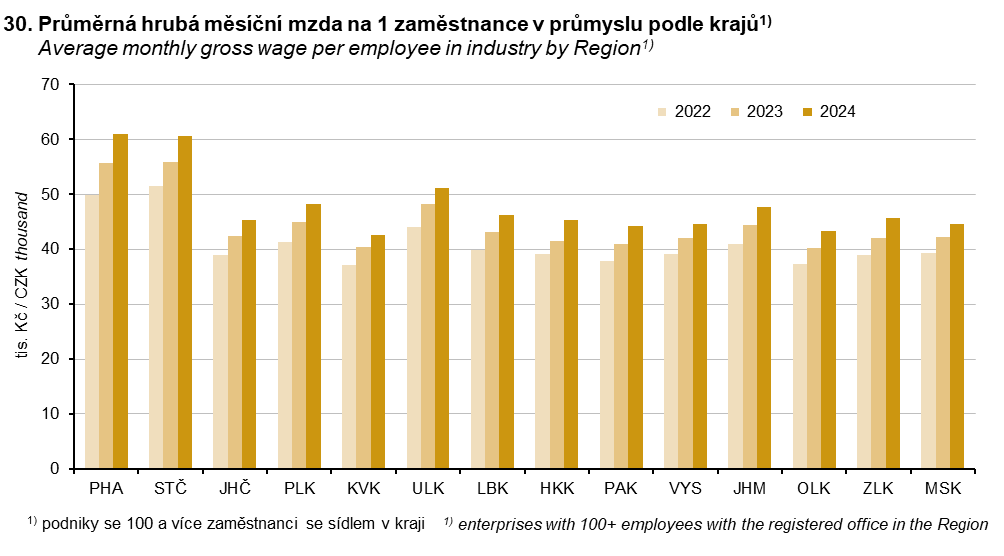 Graf 30 Průměrná hrubá měsíční mzda na 1 zaměstnance v průmyslu podle krajů