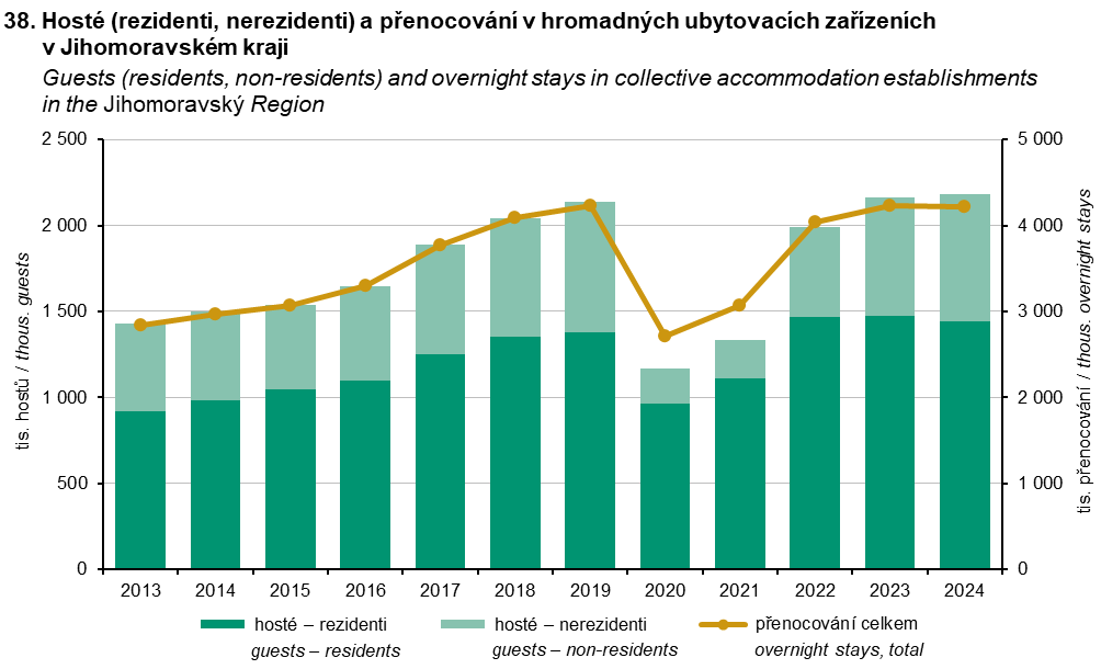 Graf 38 Hosté (rezidenti, nerezidenti) a přenocování v hromadných ubytovacích zařízeních v Jihomoravském kraji