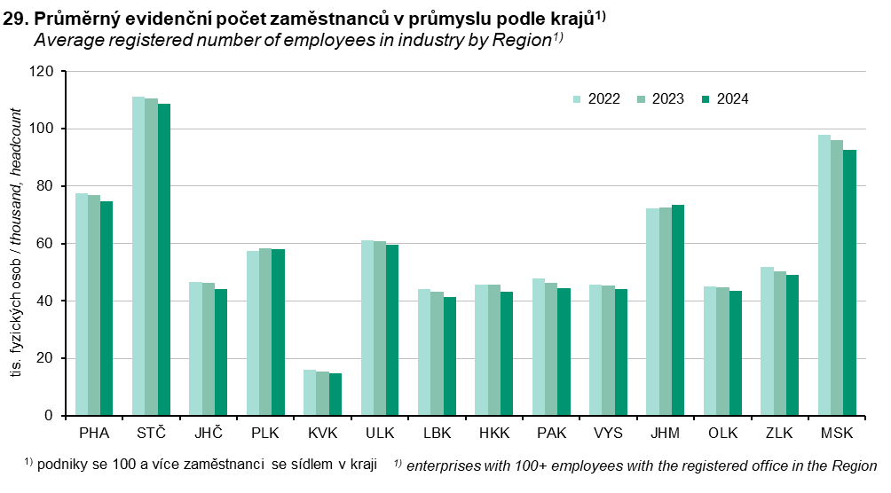 Graf 29 Průměrný evidenční počet zaměstnanců v průmyslu podle krajů
