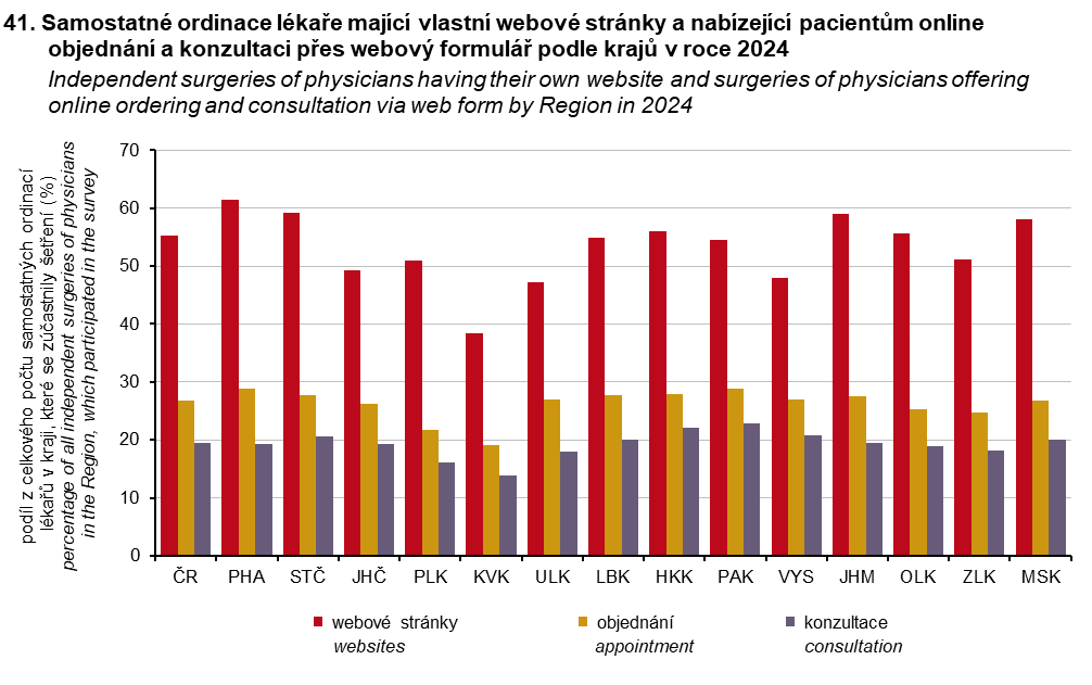 Graf 41 Samostatné ordinace lékaře mající vlastní webové stránky a nabízející pacientům online objednání a konzultaci přes webový formulář podle krajů v roce 2024