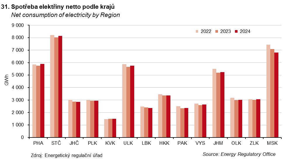 Graf 31 Spotřeba elektřiny netto podle krajů