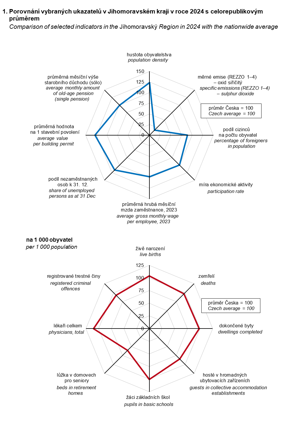 Graf 1 Porovnání vybraných ukazatelů v Jihomoravském kraji v roce 2024 s celorepublikovým průměrem