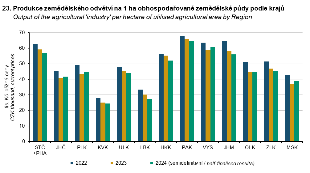 Graf 23 Produkce zemědělského odvětví na 1 ha obhospodařované zemědělské půdy podle krajů
