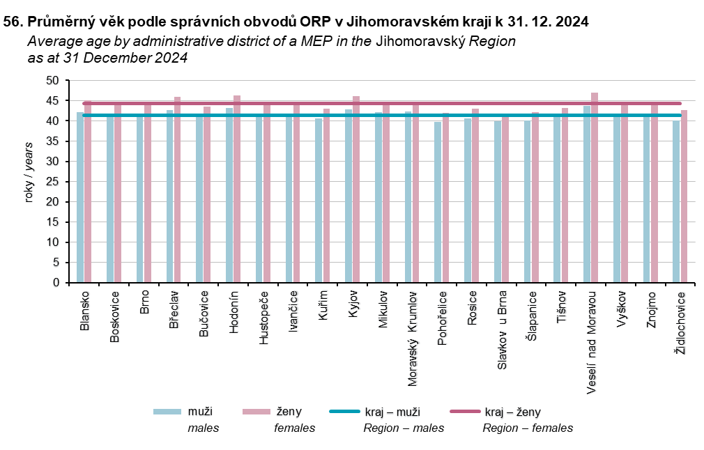 Graf 56 Průměrný věk podle správních obvodů ORP v Jihomoravském kraji k 31. 12. 2024