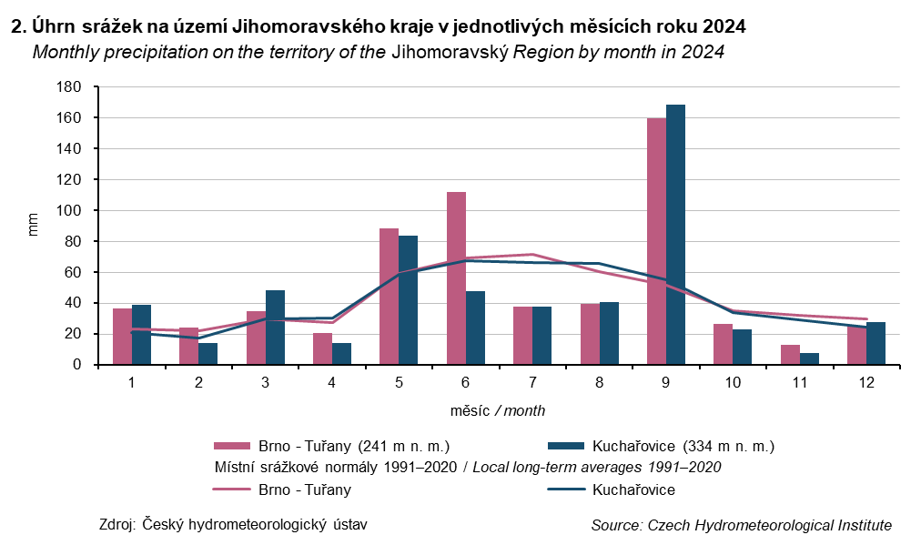 Graf 2 Úhrn srážek na území Jihomoravského kraje v jednotlivých měsících roku 2024