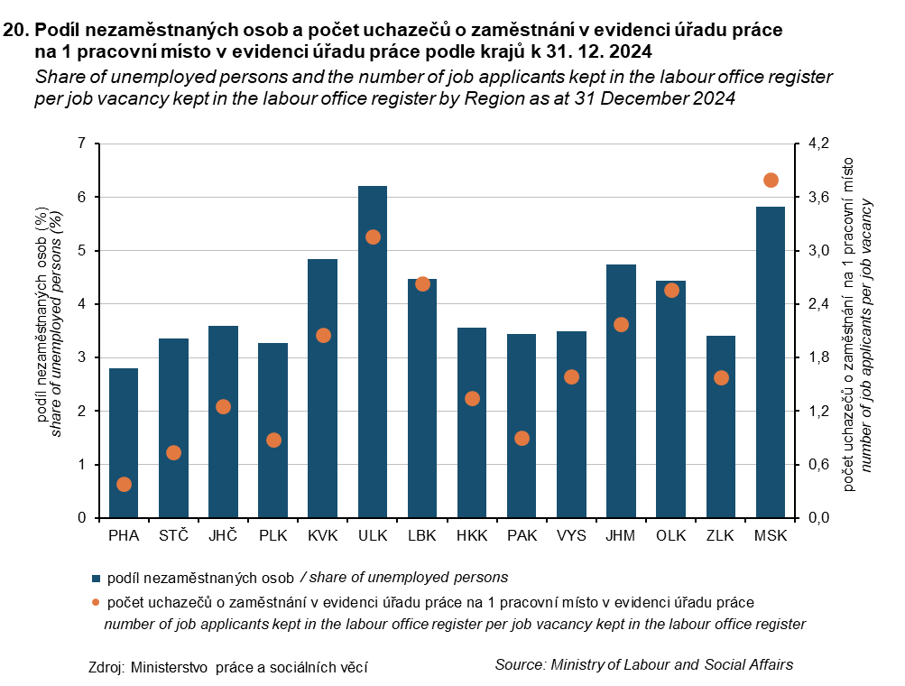 Graf 20 Podíl nezaměstnaných osob a počet uchazečů o zaměstnání v evidenci úřadu práce na 1 pracovní místo v evidenci úřadu práce podle krajů k 31. 12. 2024
