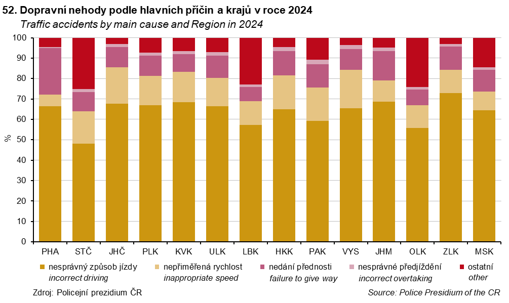 Graf 52 Dopravní nehody podle hlavních příčin a krajů v roce 2024