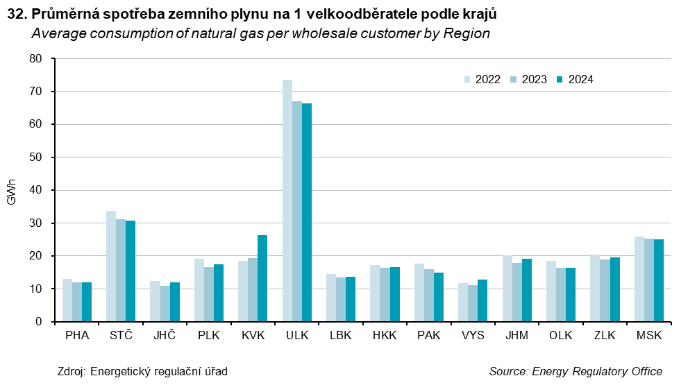 Graf 32 Průměrná spotřeba zemního plynu na 1 velkoodběratele podle krajů