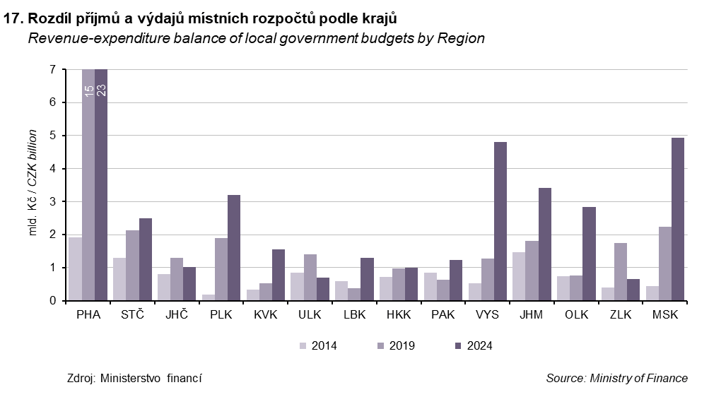 Graf 17 Rozdíl příjmů a výdajů místních rozpočtů podle krajů